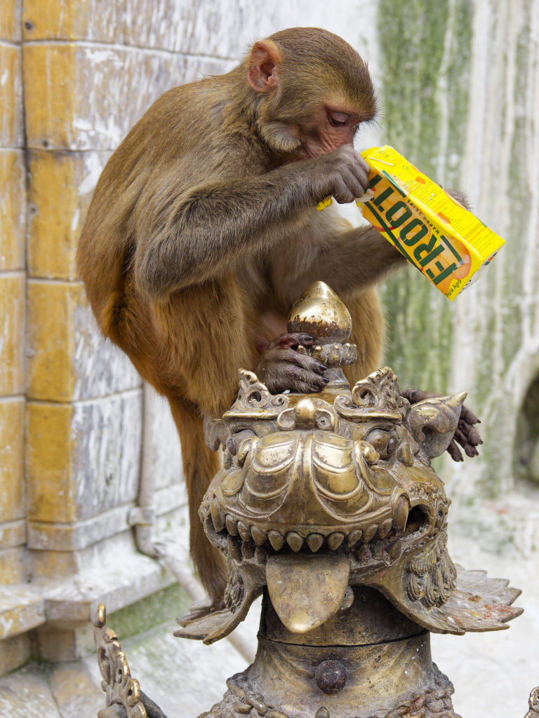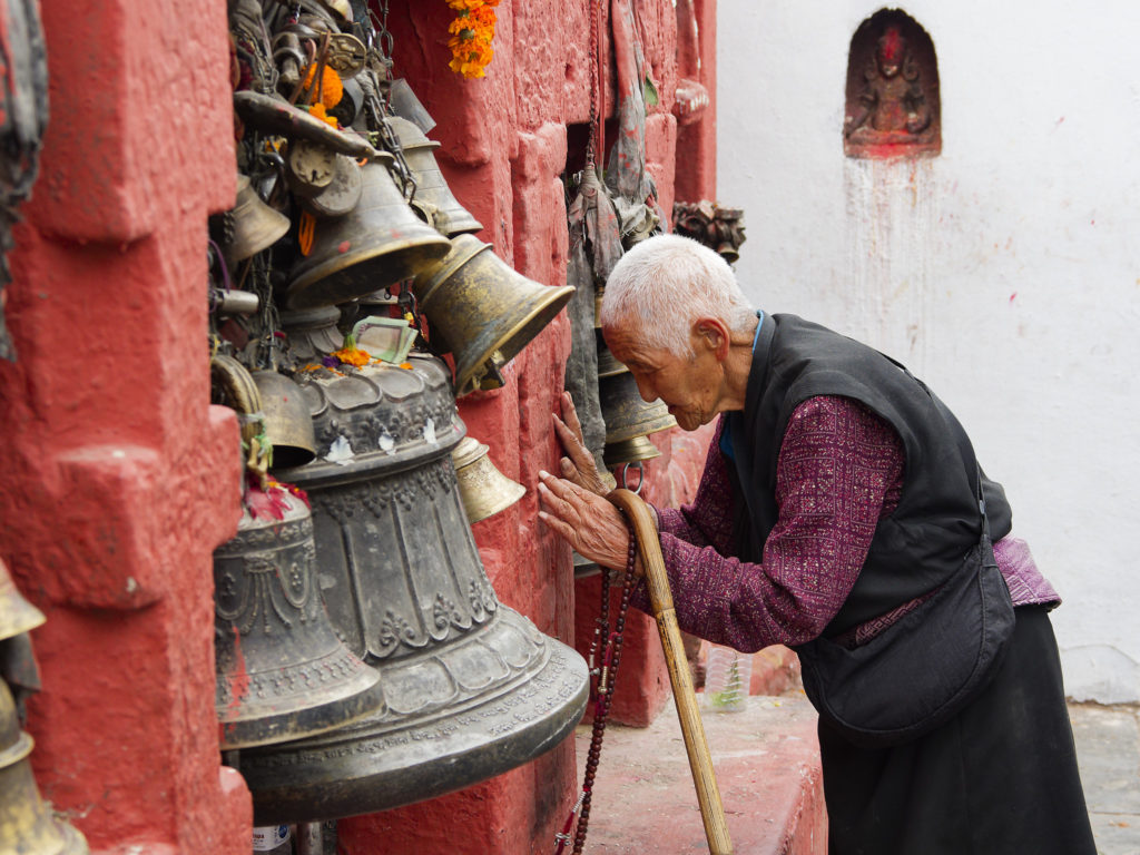 Über der Stadt thront Swayambhunath, einer der ältesten buddhistischen Tempel Nepals, der allerdings auch von Hindus verehrt wird. Die weißen Kuppeln, die goldene Spitze und die allsehenden Buddha-Augen symbolisieren den Weg zur Erleuchtung. Zwischen flatternden Gebetsfahnen findet man hier dutzende Makaken, die dem Tempel den Beinamen Affentempel eingebracht haben. Leider war es heute nicht mehr so klar wie gestern – eine relativ dichte Wockendecke und der darunterliegende Smog haben die Sicht heute etwas eingetrübt. Spannend war aber sowieso eher, dem religiösen Treiben zuzusehen und sich klarzumachen, dass Religion hier das Leben massiv bestimmt und wie krass der Unterschied zu säkularisierten Ländern wie Deutschland ist.