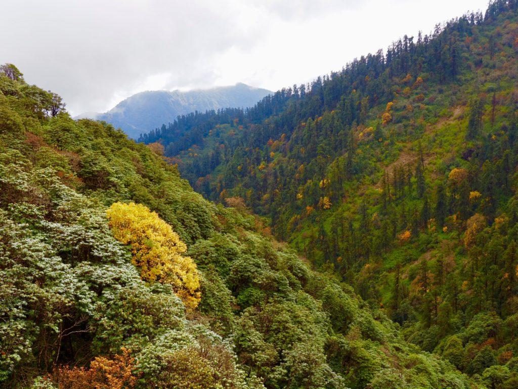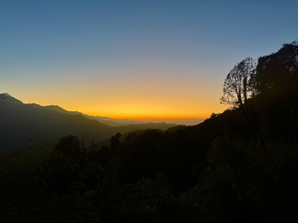 Die Blicke auf die Berge des Himalaya verändern sich jeden Tag und die Sonnenaufgänge werden immer spektakulärer. Die ersten Tage Trecking waren auch noch ganz gut machbar, mit ca 7 km am Tag, gestern sind wir jedoch an unser (wenig trainiertes) Limit gekommen. Los ging es vor Sonnenaufgang mit einem kurzen Weg von 1,5 km auf den Muldei Peak und danach für fast 8 Stunden 14 km erst mehr als 700 m runter und dann fast 900 m wieder hoch auf fast 3700 m. Aber wir haben es 15 min vor der Dunkelheit geschafft.
